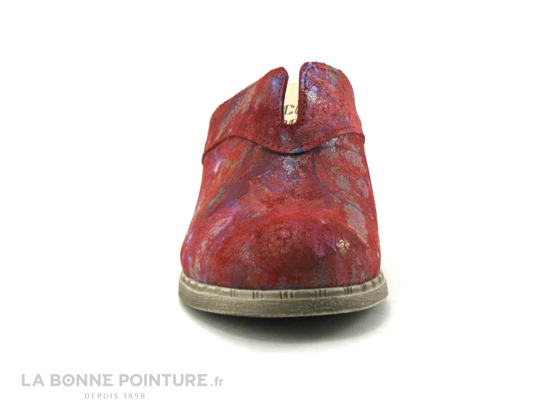 Ce sabot mode Femme est en cuir velouté rouge imprimé floral, aux légers tons de bleu, de jaune et de vert.