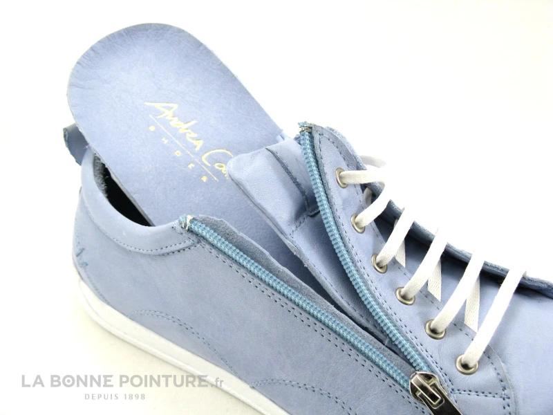La fermeture éclair sur le côté permet de fermer facilement les sneakers Femme Andrea Conti bleu pastel, que vous pourrez ajuster avec le lacet blanc.