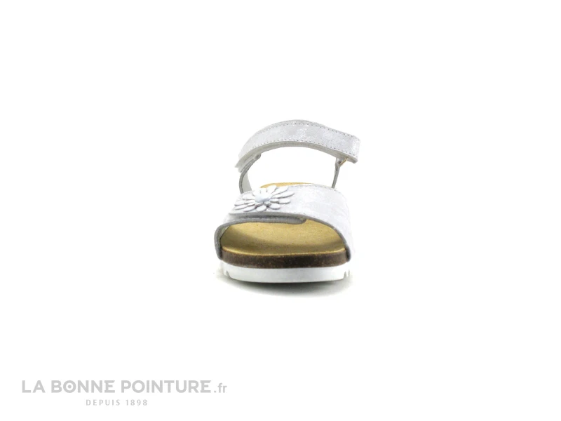 Cette sandale fille Bopy est en cuir blanc et argent métallisé, avec une bride velcro sur l’avant qui permet d’ajuster la chaussure au pied de l’enfant. Cette bride est ornée d’une jolie fleur aux pétales blanc et argentés.