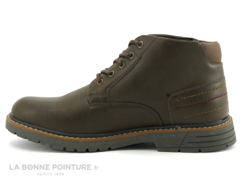 Ces bottillons à lacet Homme Broker & Co sont en simili cuir marron foncé, avec de discrètes coutures camel et bordeaux à l’arrière.