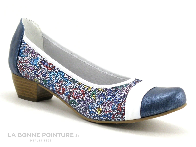 Cet escarpin Inéa Rio mélange un cuir bleu métallisé et un cuir imprimé multicolore, avec une bande blanche entre les deux.