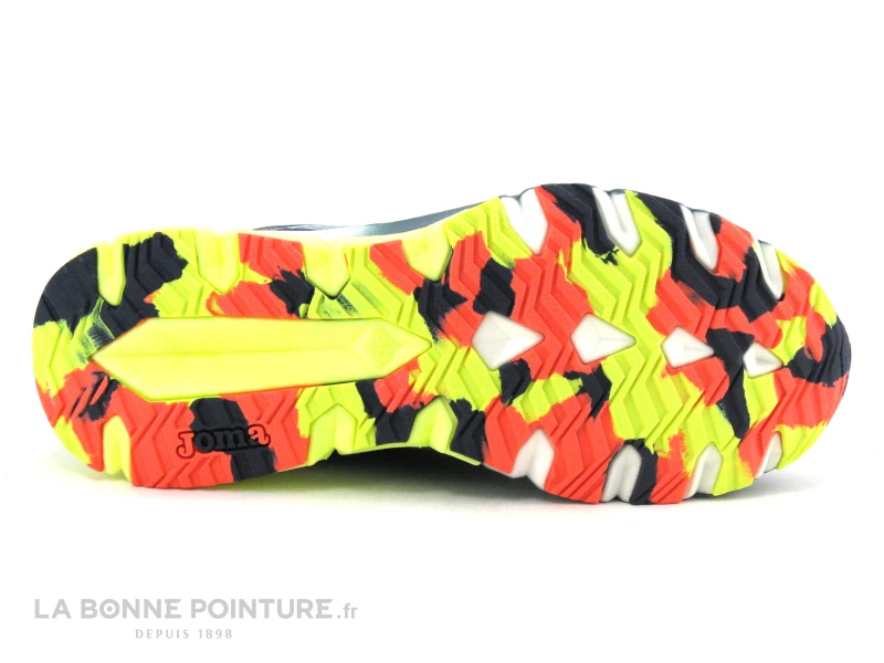 La semelle de marche des chaussures de sport Homme Joma R-Fenix est épaisse avec un bon amorti. Cette semelle jaune et verte se démarque avec sa base en caoutchouc multicolore.