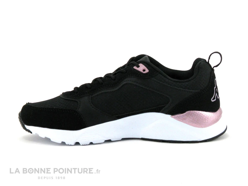 Cette chaussure Femme Kappa Bradynyw est en textile et matières synthétiques résistantes noires, avec une partie rose métallisé à l’arrière.