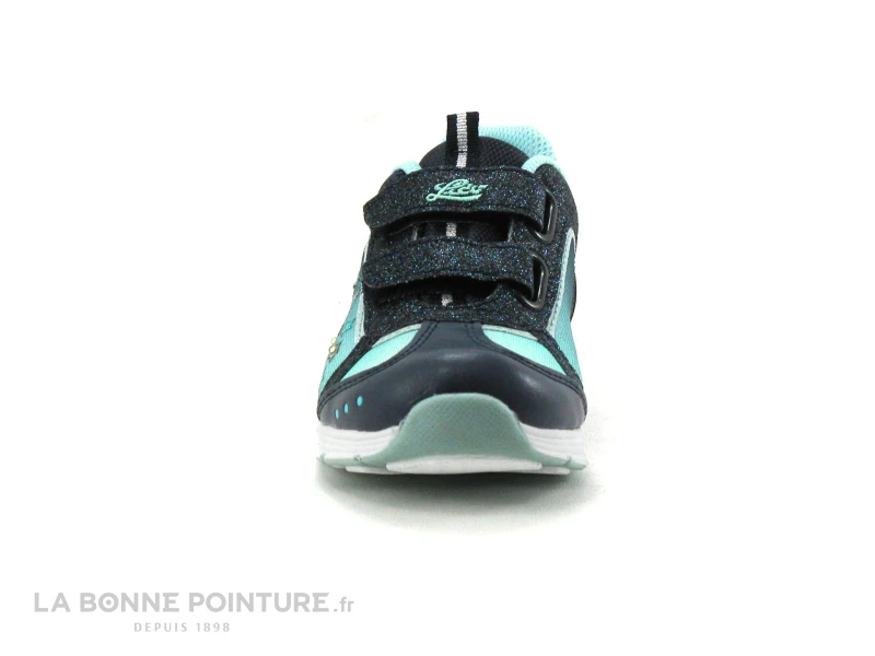 Cette tennis clignotantes fille est bleu marine et turquoise, avec des parties pailletées et une licorne argentée sur le côté externe de la chaussure.