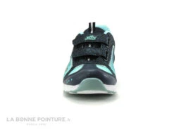 Fermeture facile avec un zip sur le côté, le lacet bicolore bleu marine et jaune traverse 4 oeillets et 2 crochets pour ajuster les boots rando enfant.