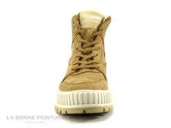Cette chaussure montante enfant est principalement en cuir velouté marron camel, avec du marron foncé sur le haut des boots Palladium enfant.