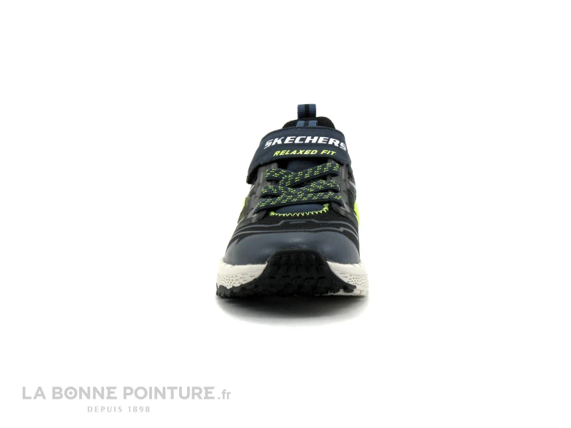 Cette basket enfant est en textile et matières résistantes bleu marine et noir, avec une touche de jaune lime.