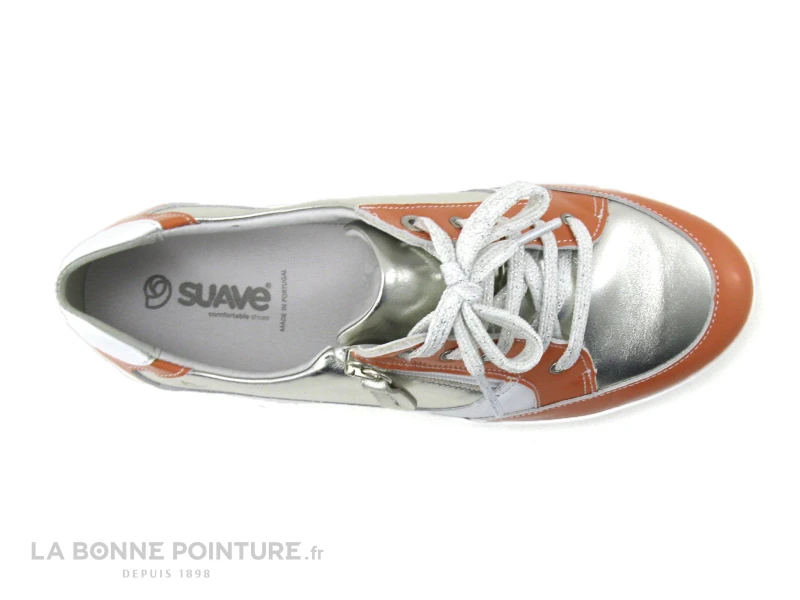 Cette basket confortable Femme Suave Florence mélange un cuir verni orange, un cuir argent et un cuir lisse blanc.
